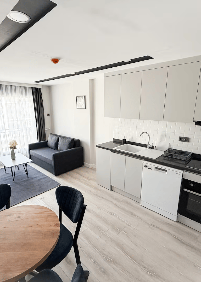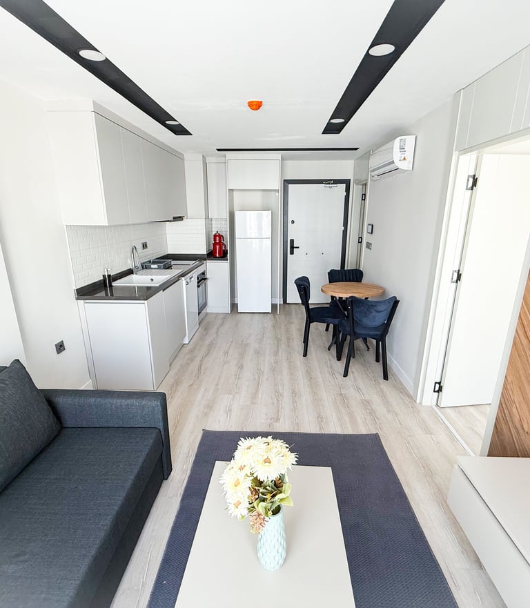 Ayrı bir yatak odası ve geniş bir oturma alanı bulunan modern daire, rahat ve fonksiyonel bir konaklama deneyimi sunar. Hem kısa hem uzun süreli konaklamalar için ideal olan daire, ev konforunu aratmayan tüm imkanlara sahiptir.